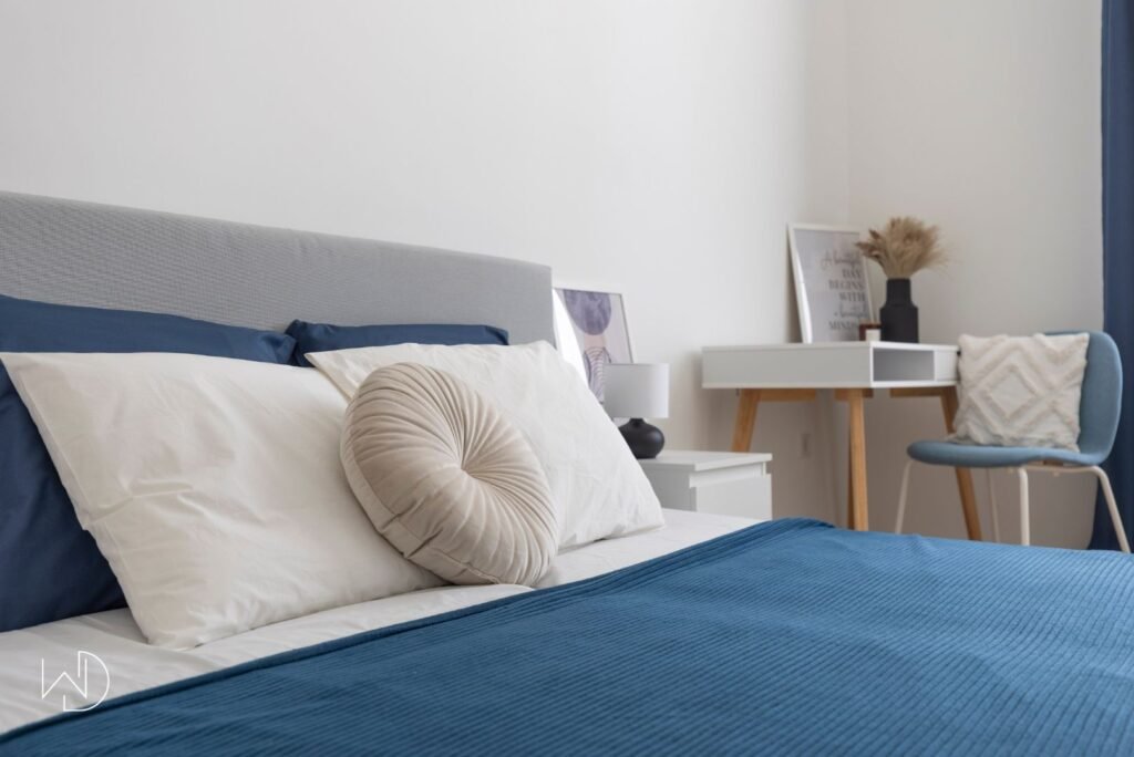 Kék, barna és fehér – modern színpaletta a kiadásra felkészített lakásban